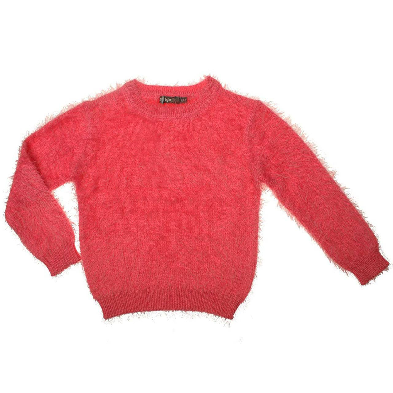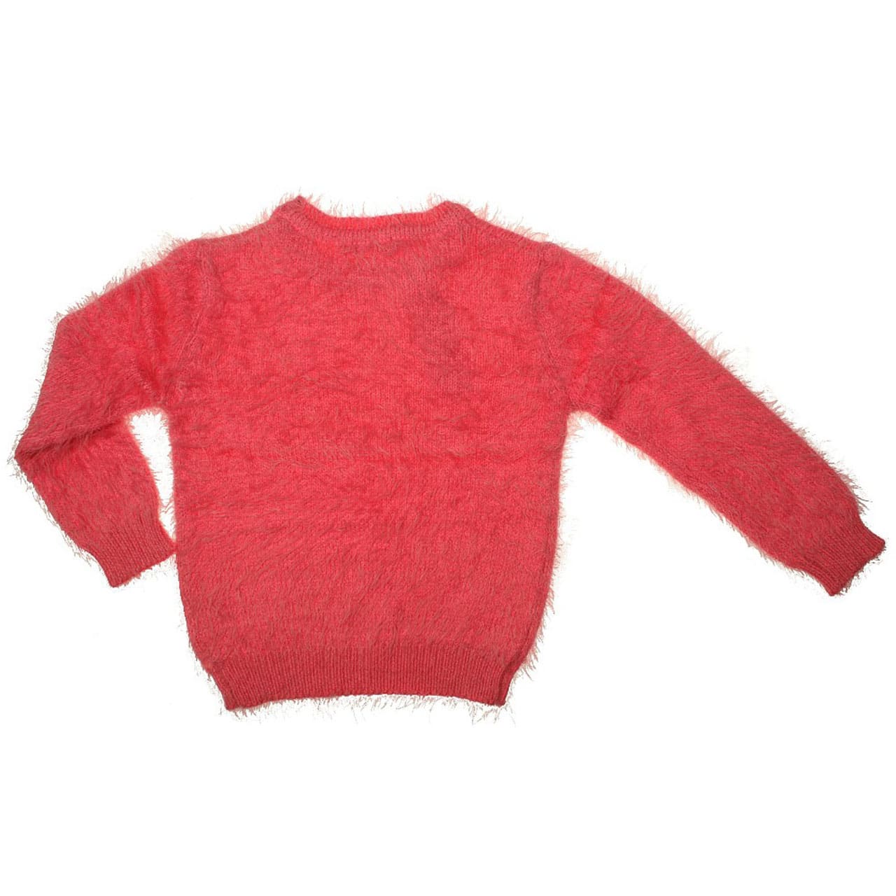 Mädchenpullover in rosa-rotem Wuschel-Style. Schön warm für die kalte Jahreszeit. Mit Bündchen an Armen und Taille.