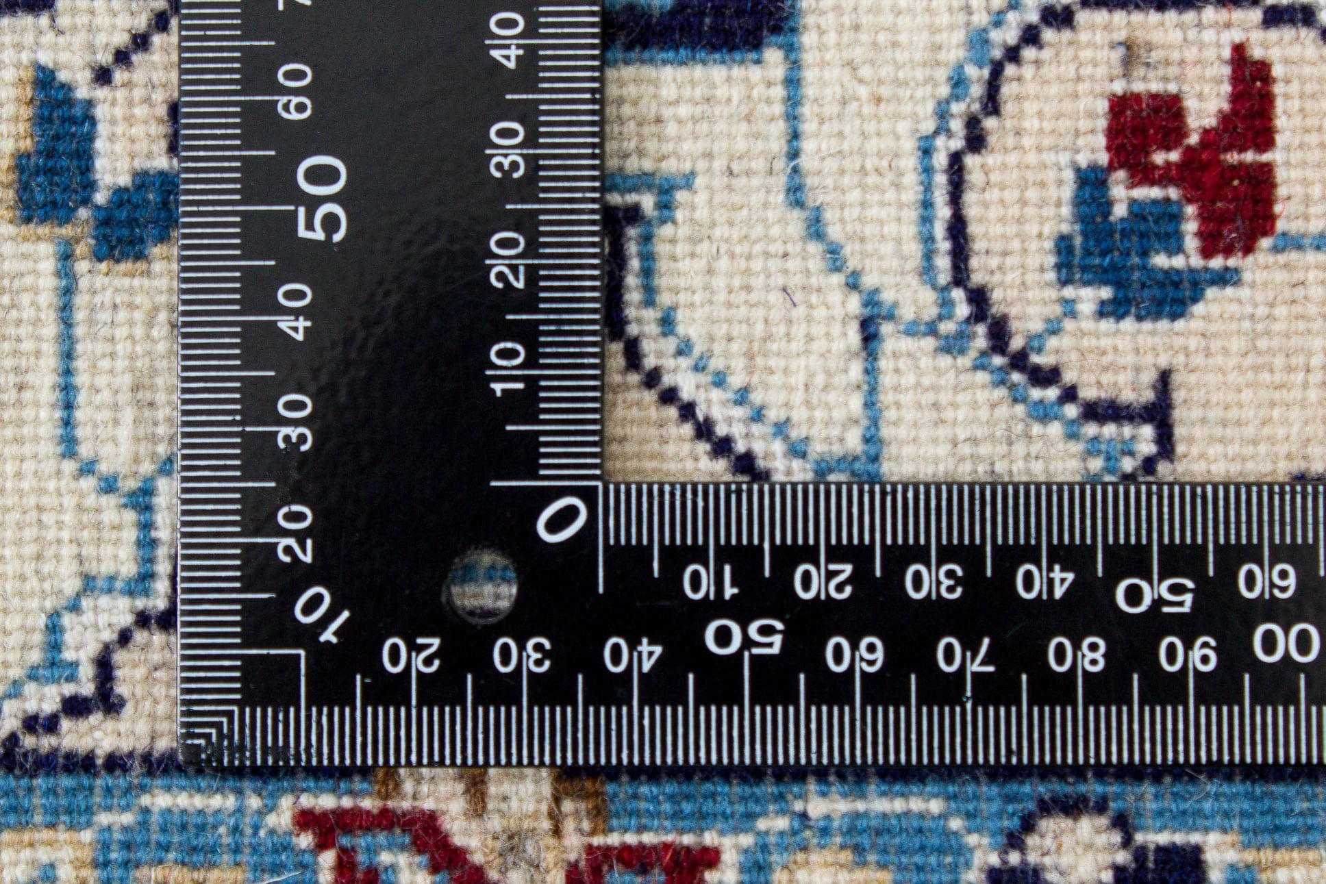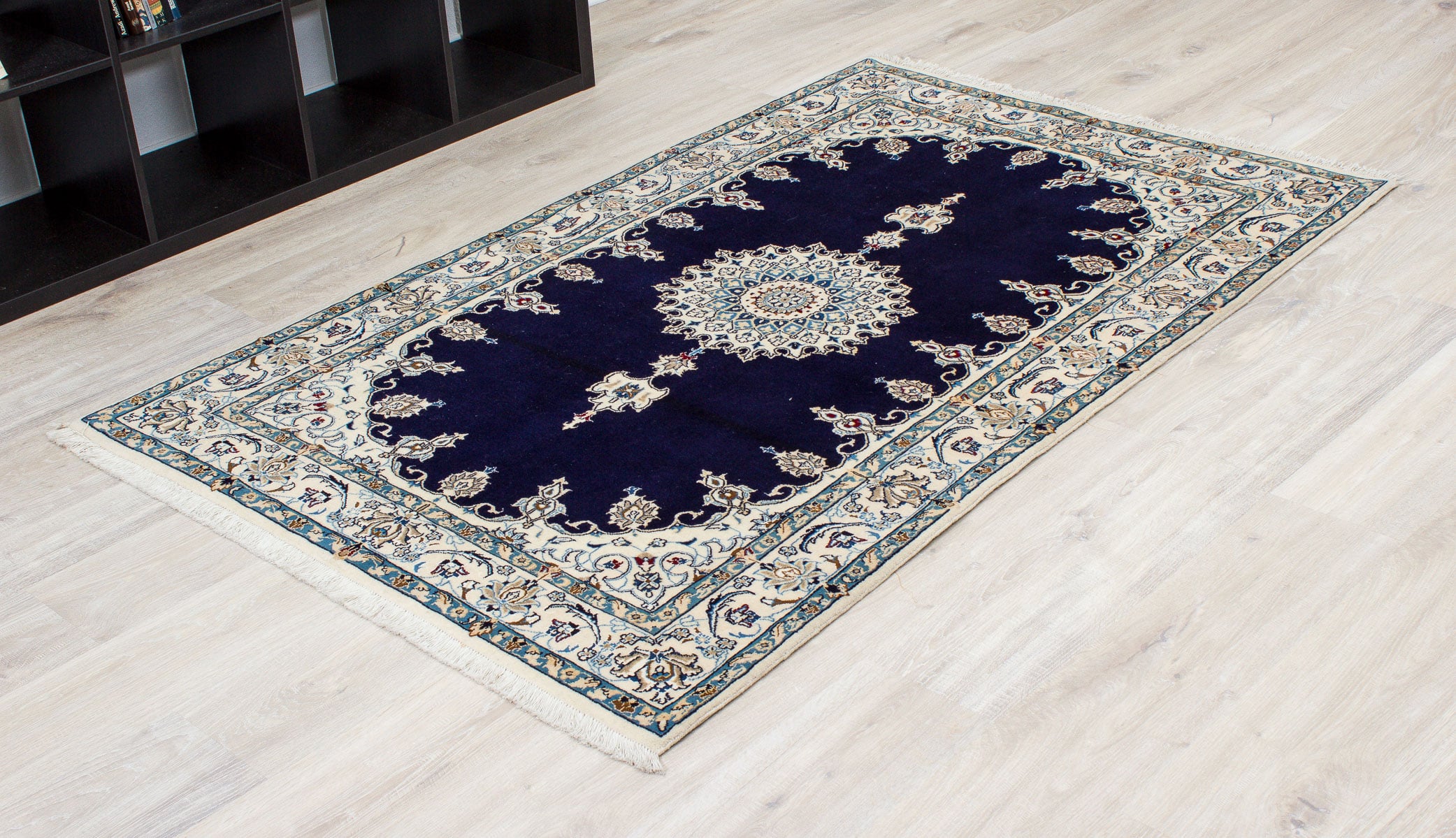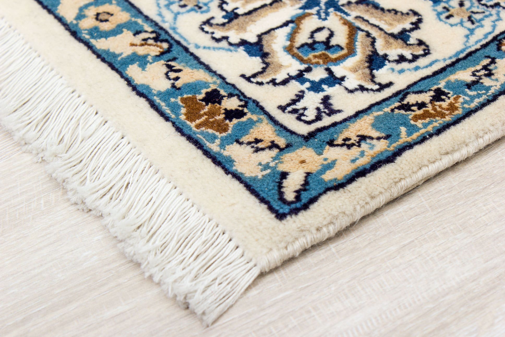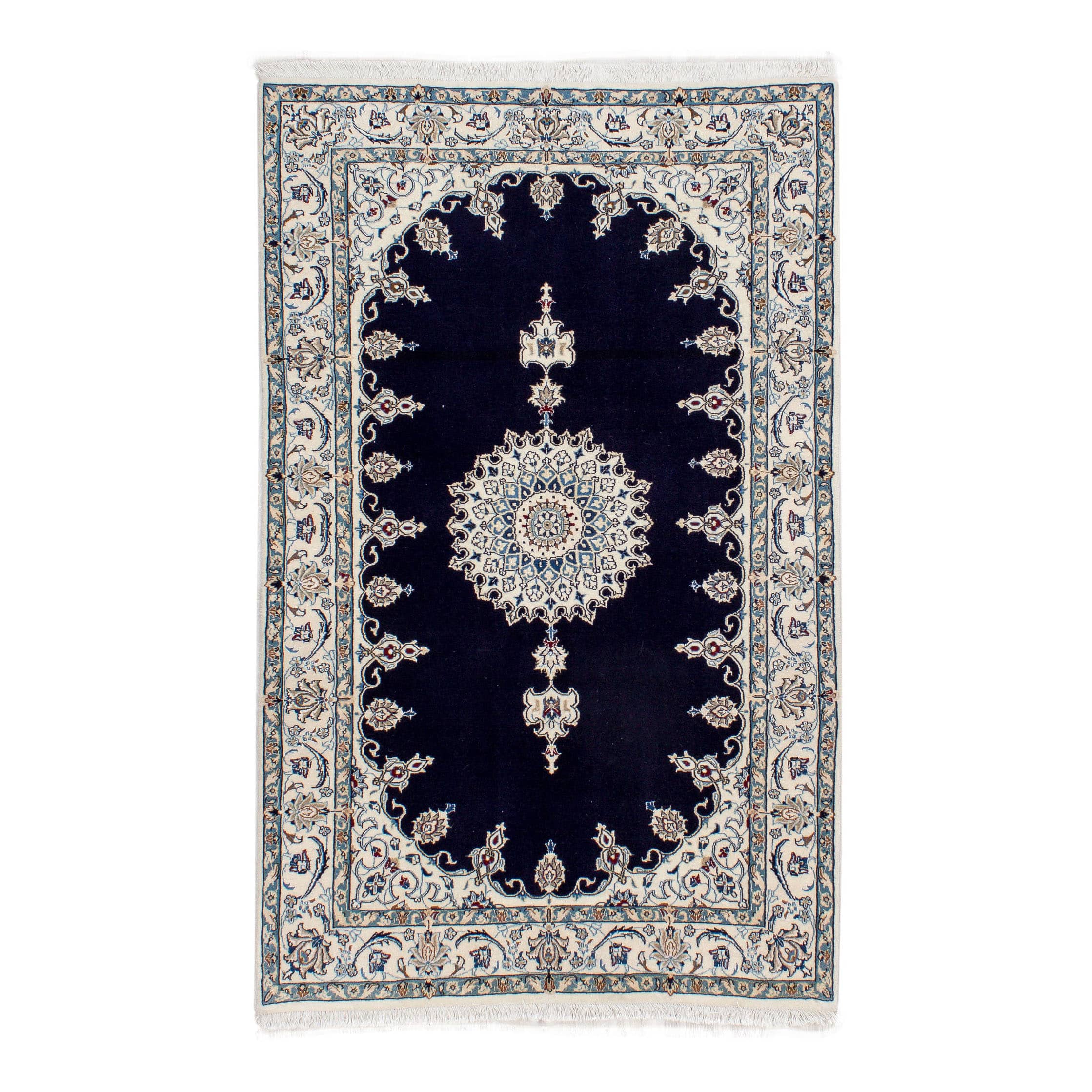 Dieser neue handgeknüpfte Teppich hat eine Breite von 123 cm und eine Länge von 195 cm. Das Circa-Maß dieses Teppichs ist 120 x 200 cm. Es handelt sich um einen echten persischen Teppich (Perserteppich). Gerne stellen wir Ihnen ein Zertifikat aus, das die Echtheit bestätigt. Der Teppich hat Fransen. Der Flor ist aus Schurwolle mit Seide (<5%). Das Muster ist Nain. Dieser Teppich ist für die Nutzung auf Fußbodenheizungen geeignet.