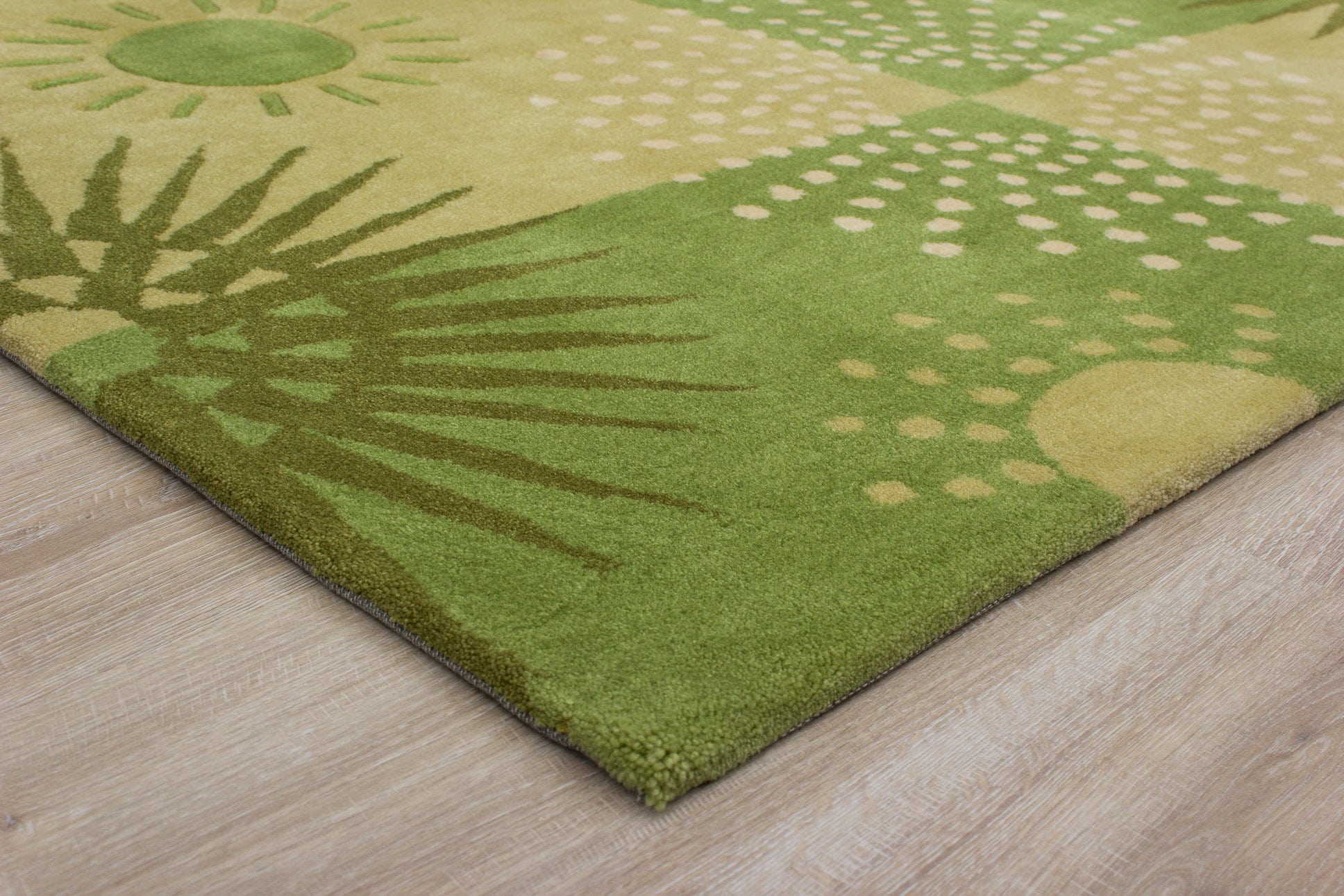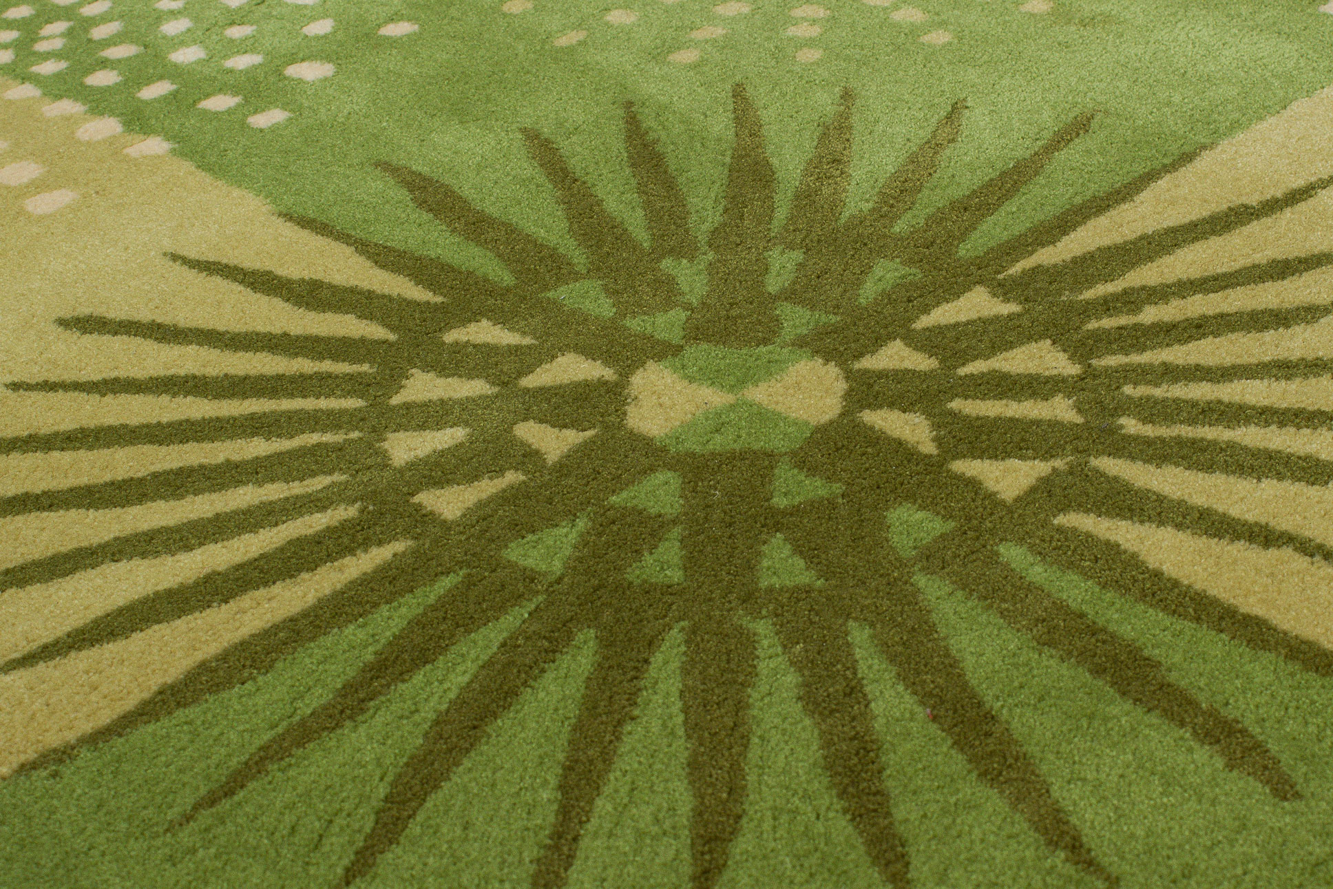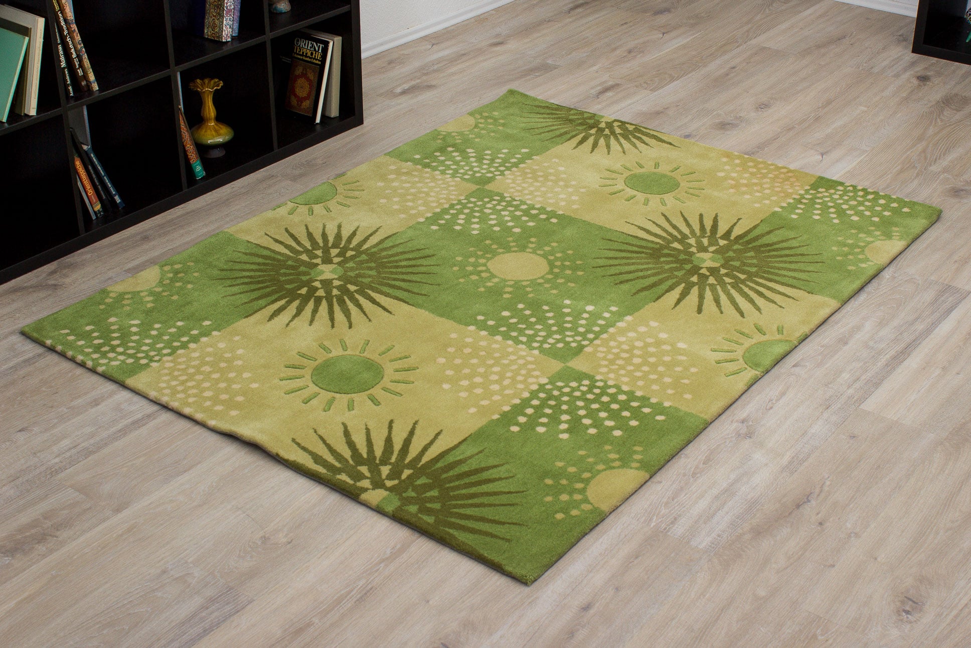 Dieser neue handgetuftete Teppich hat eine Breite von 150 cm und eine Länge von 200 cm. Das Circa-Maß dieses Teppichs ist 150 x 200 cm. Es handelt sich um einen handgetufteten Teppich aus Europa. Der Teppich hat keine Fransen. Der Flor ist aus Schurwolle. Das Muster ist Modern. Dieser Teppich ist für die Nutzung auf Fußbodenheizungen geeignet.