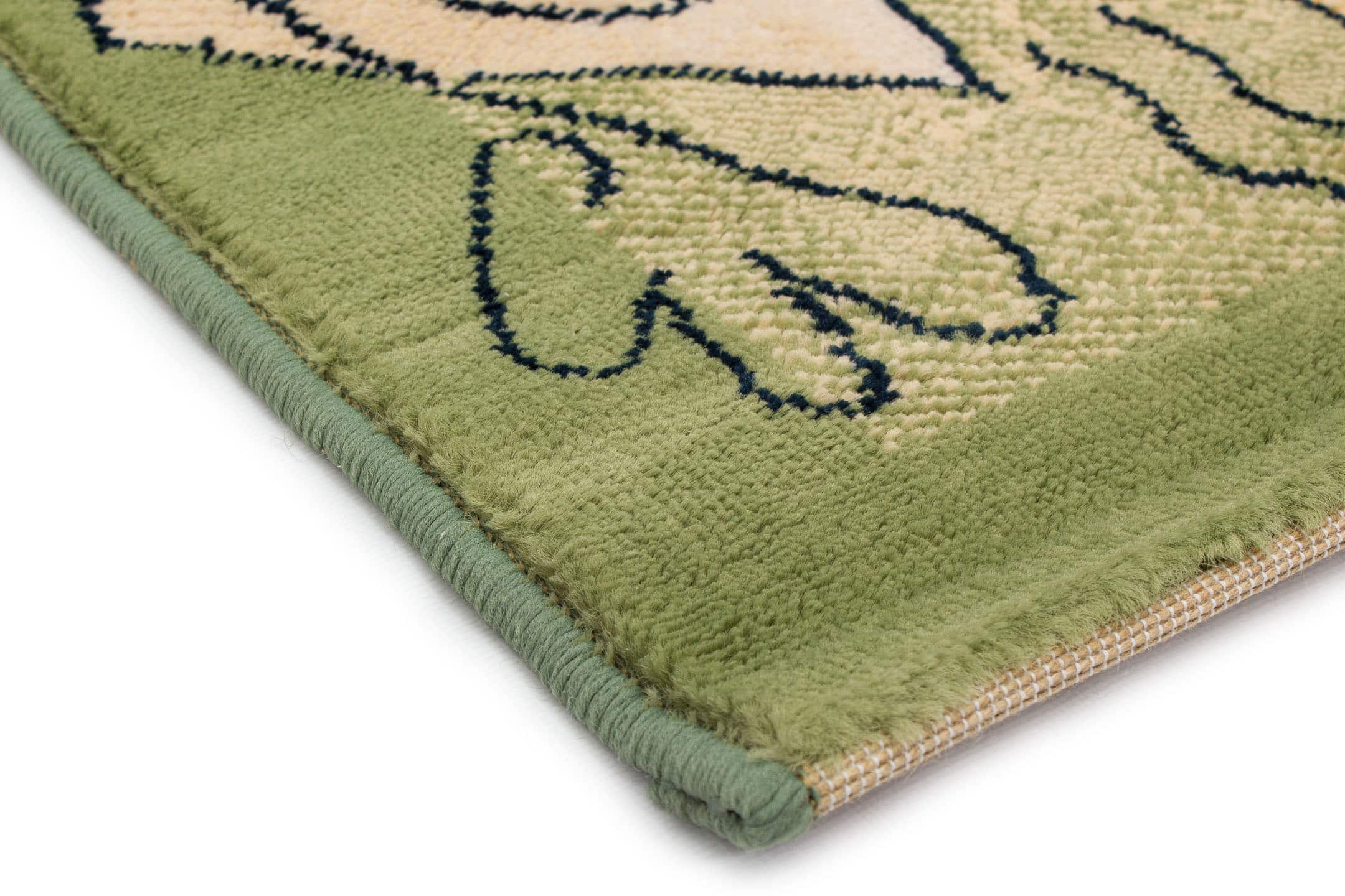 Das Muster dieses Teppichs ist mit einer Bordüre umrandet.
