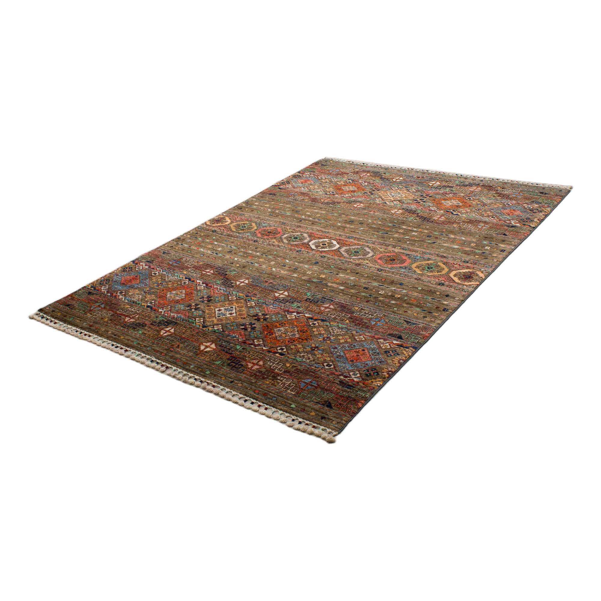 Dieser neue handgeknüpfte Teppich hat eine Breite von 151 cm und eine Länge von 205 cm und ist rechteckig. Das Circa-Maß dieses Teppichs ist 150 x 210 cm. Es handelt sich um einen echten handgeknüpften Teppich aus Afghanistan. Der Teppich hat Fransen. Der Flor ist aus Schurwolle. Das Muster ist Khorjin. Dieser Teppich ist für die Nutzung auf Fußbodenheizungen geeignet.