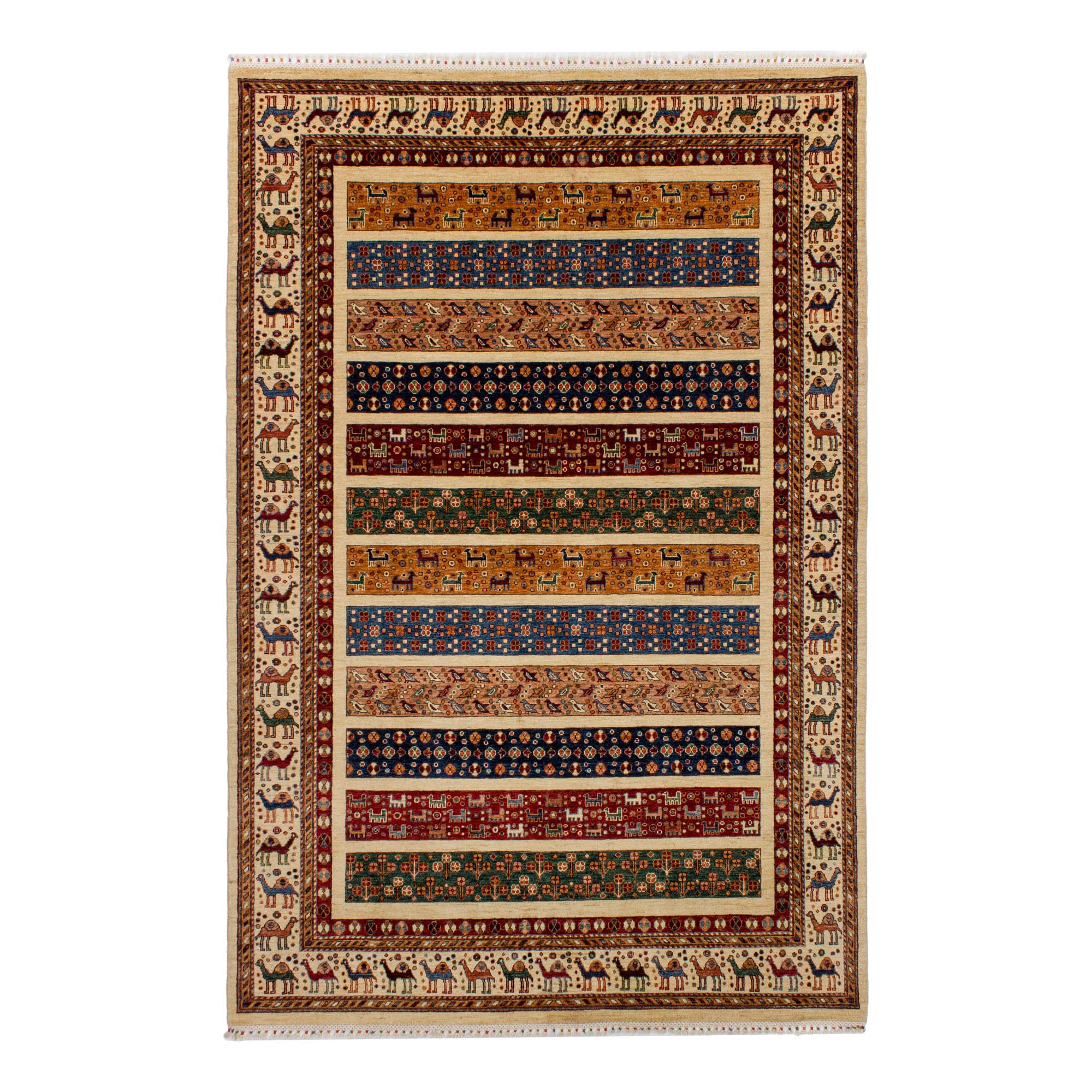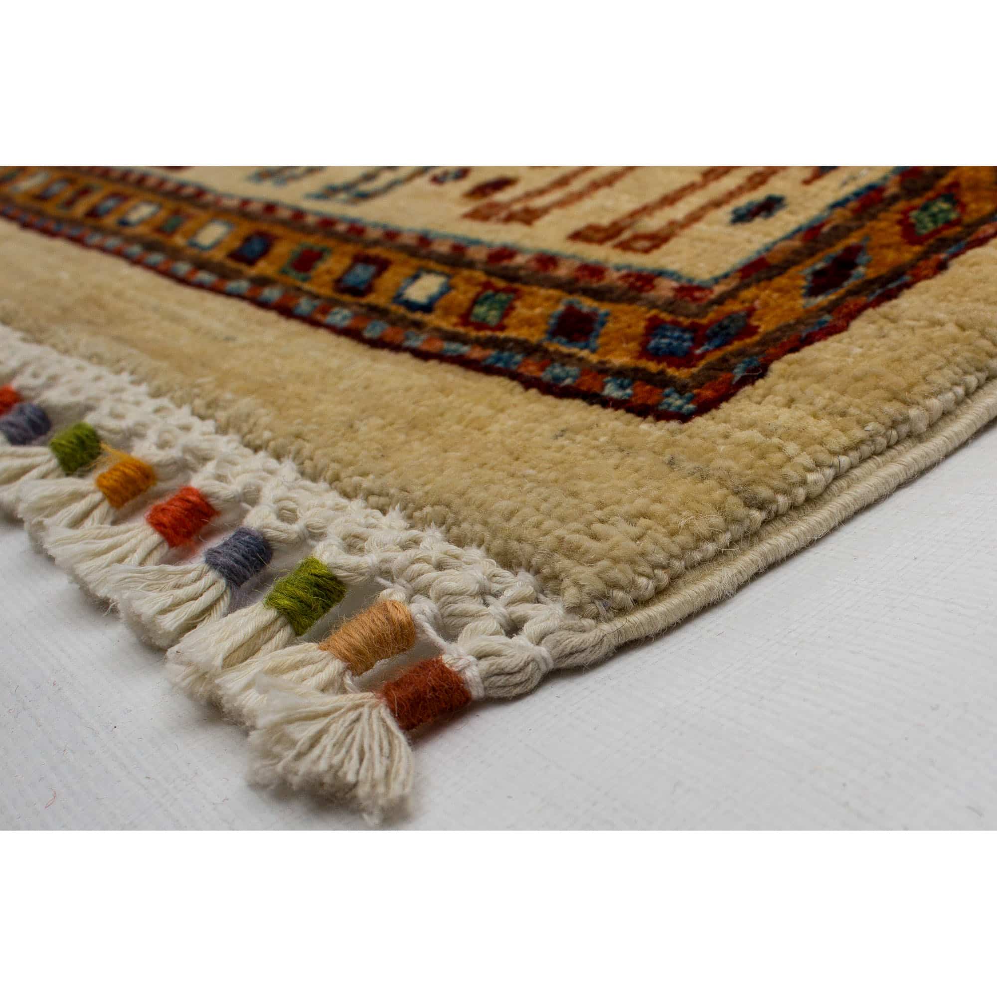Dieser neue handgeknüpfte Großteppich hat eine Breite von 205 cm und eine Länge von 306 cm und ist rechteckig. Das Circa-Maß dieses Teppichs ist 210 x 310 cm. Es handelt sich um einen echten handgeknüpften Teppich aus Afghanistan. Der Teppich hat Fransen. Der Flor ist aus Schurwolle. Das Muster ist Khorjin. Dieser Teppich ist für die Nutzung auf Fußbodenheizungen geeignet.